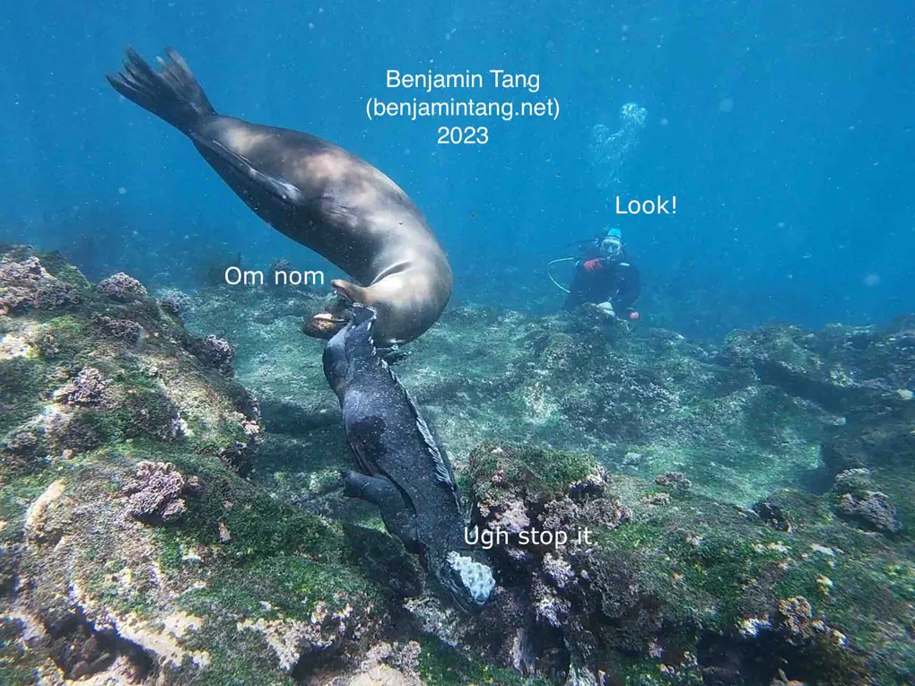 Day 5, we went down to the western side of Isla Isabella and Ferndandina, to a bay called Vicente Roca. Here is is a more secluded, sheltered bay, with colder water, as opposed to an exposed rock in the middle of the ocean such as Wolf and Darwin. It is here that we saw the diving penguins. Photos don’t do it justice, so I’ve embedded it below. You don’t usually see birds underwater!